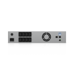 UniFi управлял стоечным источником бесперебойного питания мощностью 1,5 кВА с 4 резервными и 4 розетками для перенапряжения, сменной батареей, емкостью 216 Втч, временем работы при половинной нагрузке (500 Вт) 8 минут. Поддерживает плавное завершение работы для UNVR и UNAS, совместимость с NUT для сторонних устройств.